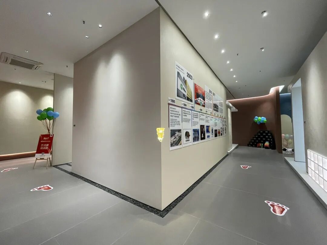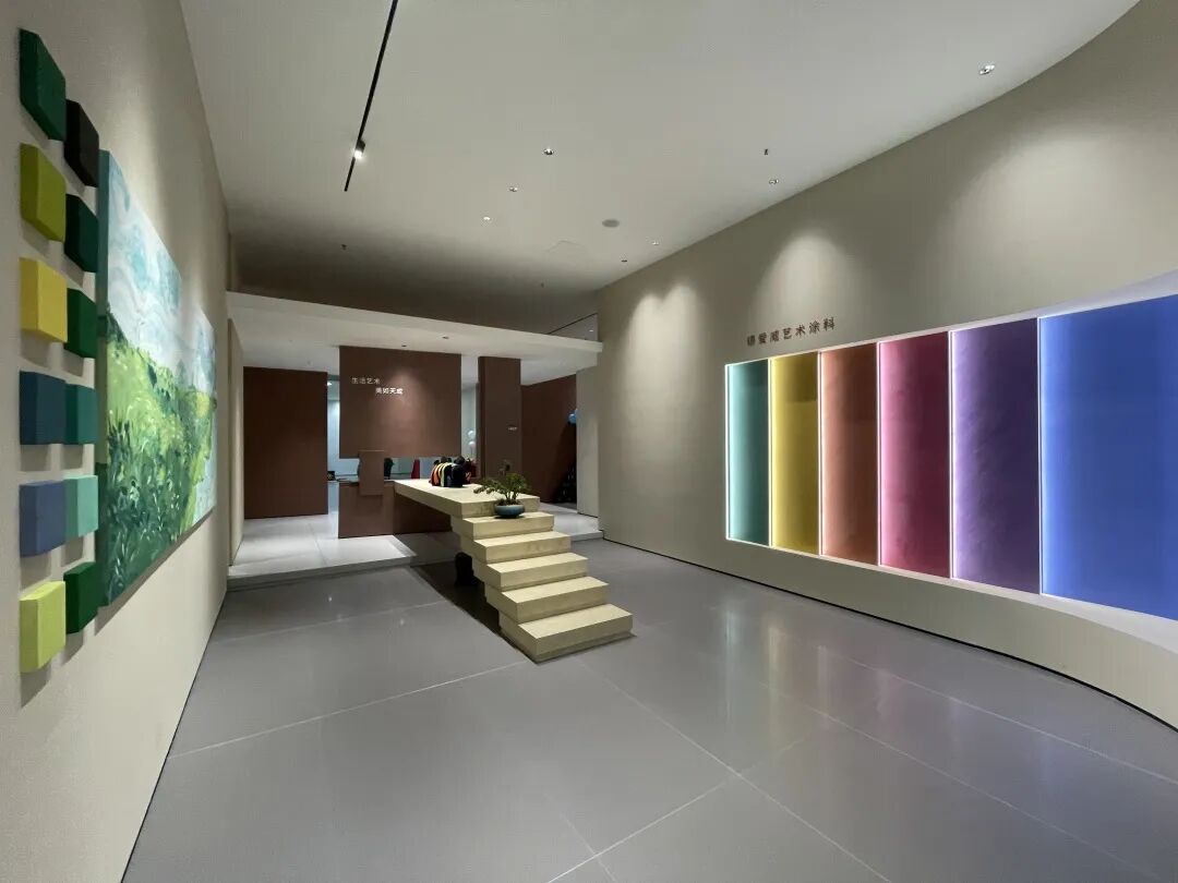 旗舰店分为乳胶漆展示区、艺术漆展示区、胶黏剂展示区、仿石漆展示区、辅材展示区、儿童游乐区、德式涂装体系展示区等全品类不同功能的产品区域和沙龙活动及办公区域。开放的形象序厅区在进门的第一视觉,就捉取眼球;简约的产品展示区将不同生活方式一一在空间中呈现;舒适的洽谈区则将工作和生活巧妙融合;各区域的产品展示宛如首饰陈列盒精致有序一目了然。