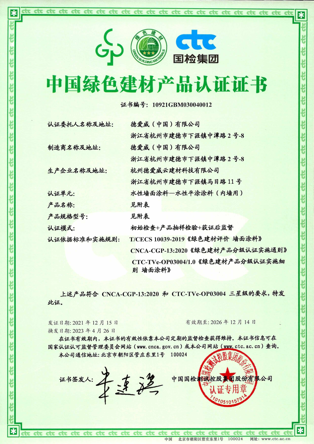 官方认证!德爱威内墙产品荣获“中国绿色建材产品”三星级证书