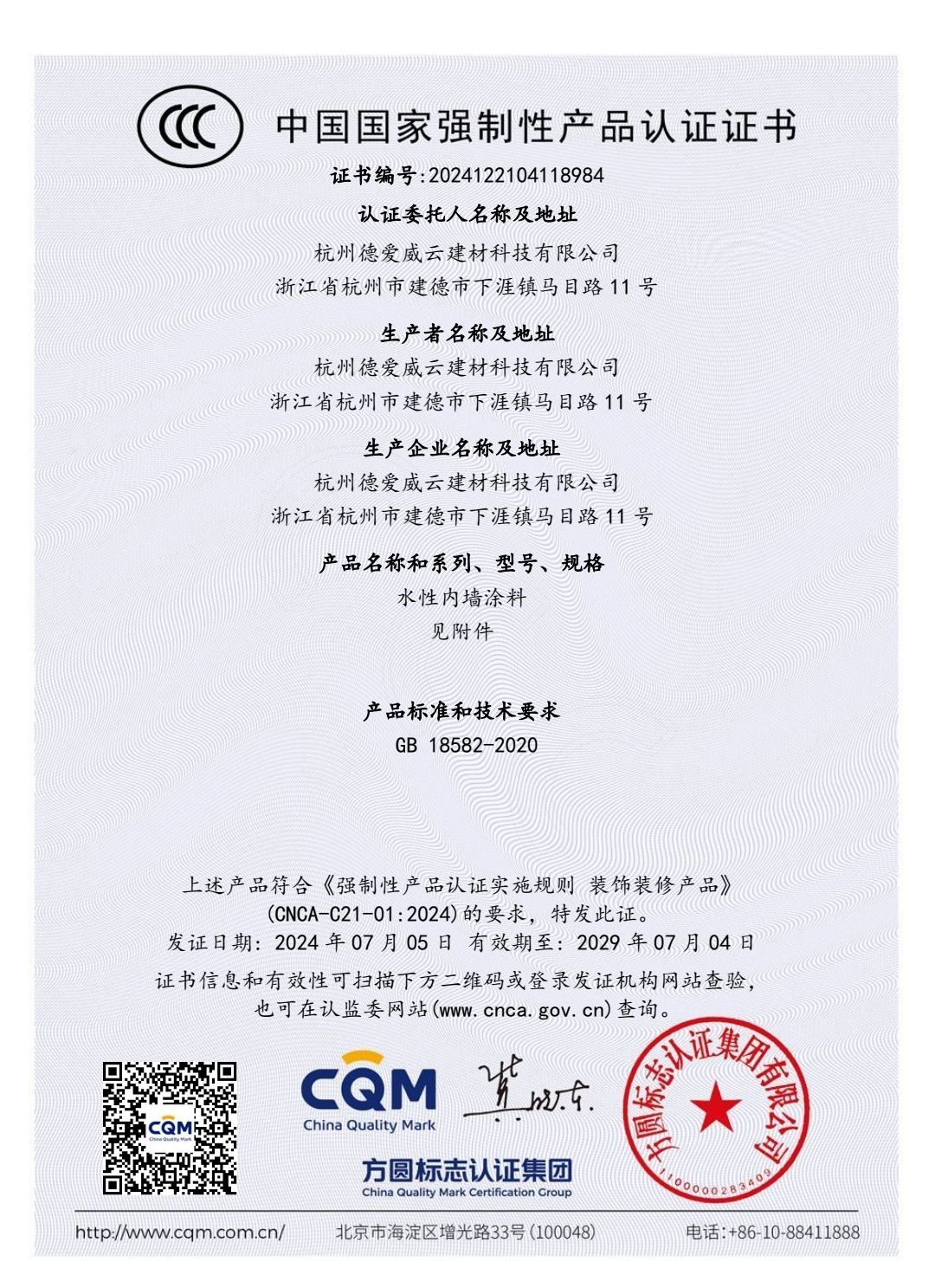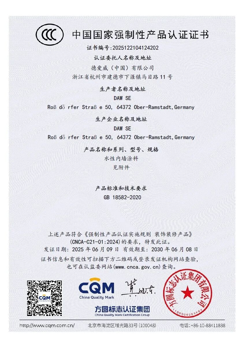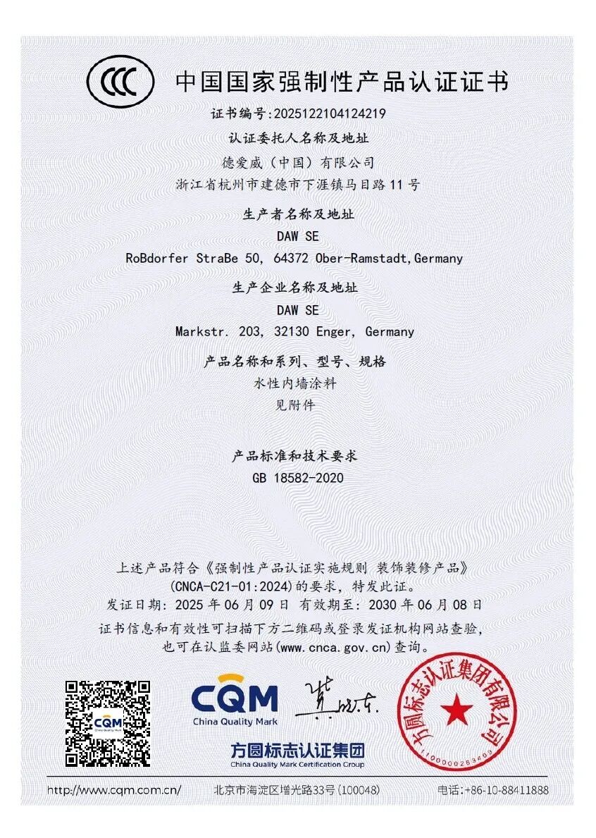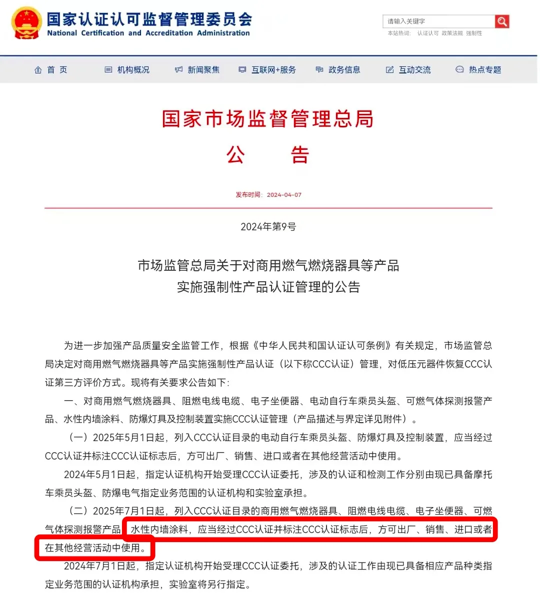 此前,国家市场监管总局制定发布公告,决定对具有较高安全风险的7种产品实施CCC认证,其中包括水性内墙涂料。公告明确自2025年7月1日起,水性内墙涂料必须通过CCC认证并标注CCC认证标志后,方可出厂、销售、进口或者在其他经营活动中使用。